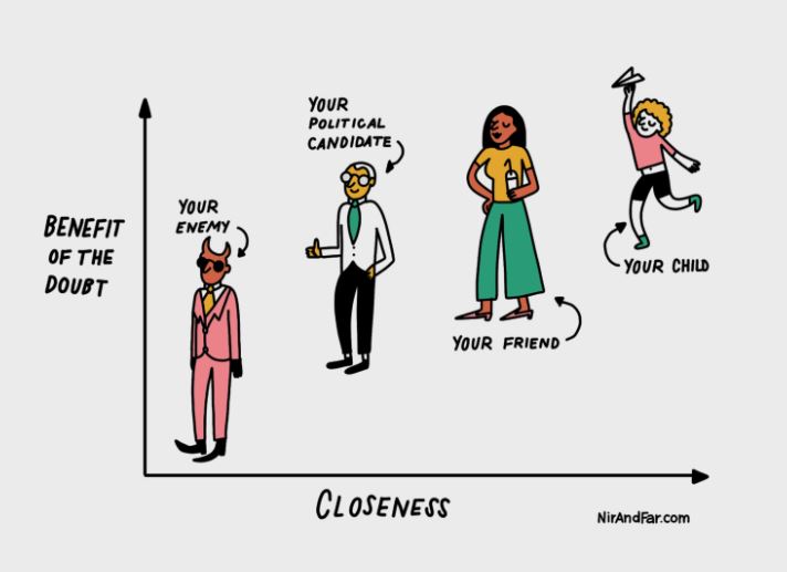 I read a great blog post recently by Nir Eyal called The Secret to True Kindness. (Check it out.) However, in the article I think Nir may have left out an important principle as to why we give people the benefit of the doubt. As I looked at his diagram screenshotted below (which is great food for thought by the way) I noticed that just because we are “close” to someone doesn’t automatically increase our level of kindness to them. In fact, the opposite may also be true. I have family relationships, as I am sure many of my readers do, where the closer we are, the harder it is to like them and the harder it is to give them the benefit of the doubt.